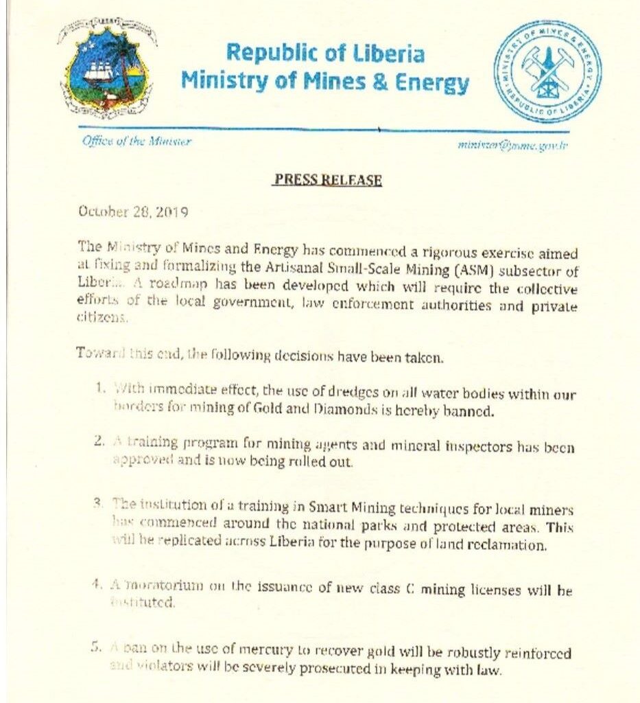 Last year, the EPA warned about the overuse of mercury in Liberian waters related to dredges, which persisted nationwide even amid the ban.