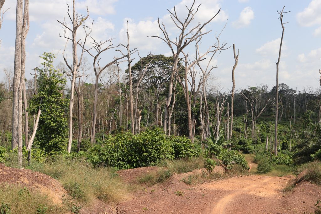 Thanks to Zammie and local forest guards, Bloquia is the only community forest that has not been cleared for cocoa farms. Burkinabe migrants have encroached upon every forest in Grand Gedeh County. The tally includes eight community forests, several large-scale logging concession areas and two proposed parks. Backed by their Liberian landlords, the migrants apply chemicals or set fire to the base of trees, gradually transforming virgin woodlands into vast forest graveyards.