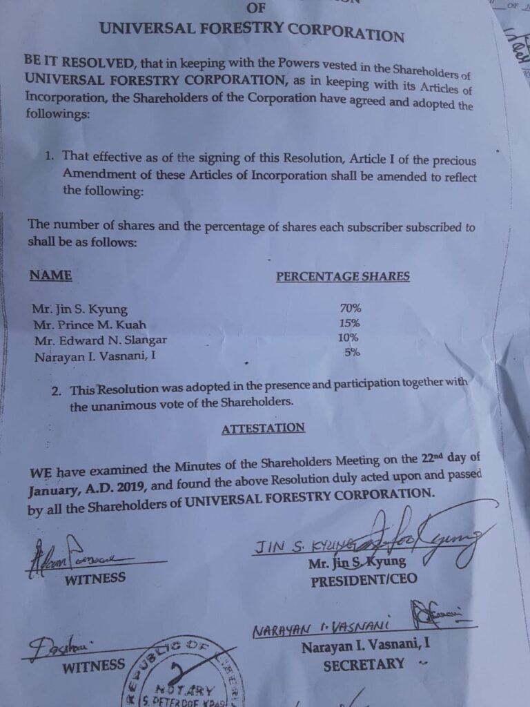 “I want to use this medium to set the record straight that there has been an amended article of incorporation to the Universal Forestry Corporation and I relinquished my share to my son [Prince Kruah]…,” Minister Kruah said in a statement on Sunday. “This amendment of the Article of Incorporation is the best evidence for the public.”