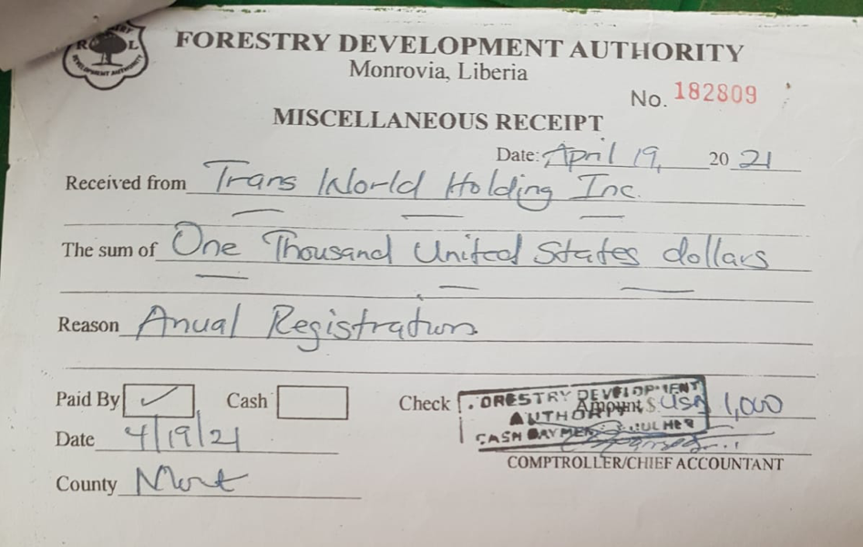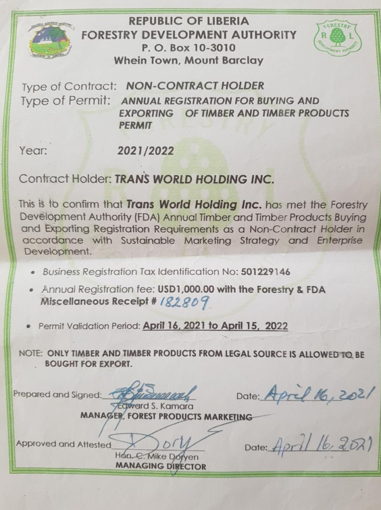 “This is to confirm that Trans World Holding Inc. has met the Forestry Development Authority annual timber and timber products buying and exporting registration requirements as a non-contract holder in accordance with sustainable marketing strategy and the enterprise development,” read the document, signed only by the two men, in April 2021.