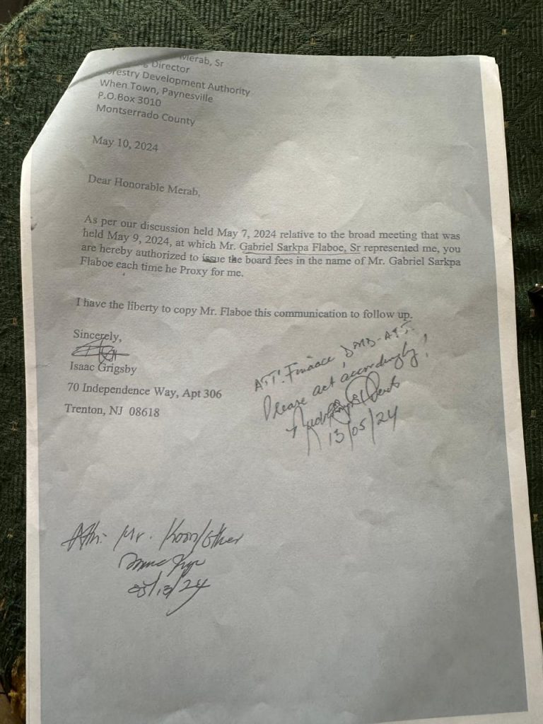 Grigsby informed FDA Managing Director Rudolph Merab about the payment procedure in May, based on a letter obtained by The DayLight. “You are hereby authorized to issue the board fees in the name of Mr. Gabriel Sarkpa Flaboe each time he [serves as a] proxy for me,” Grigsby wrote.