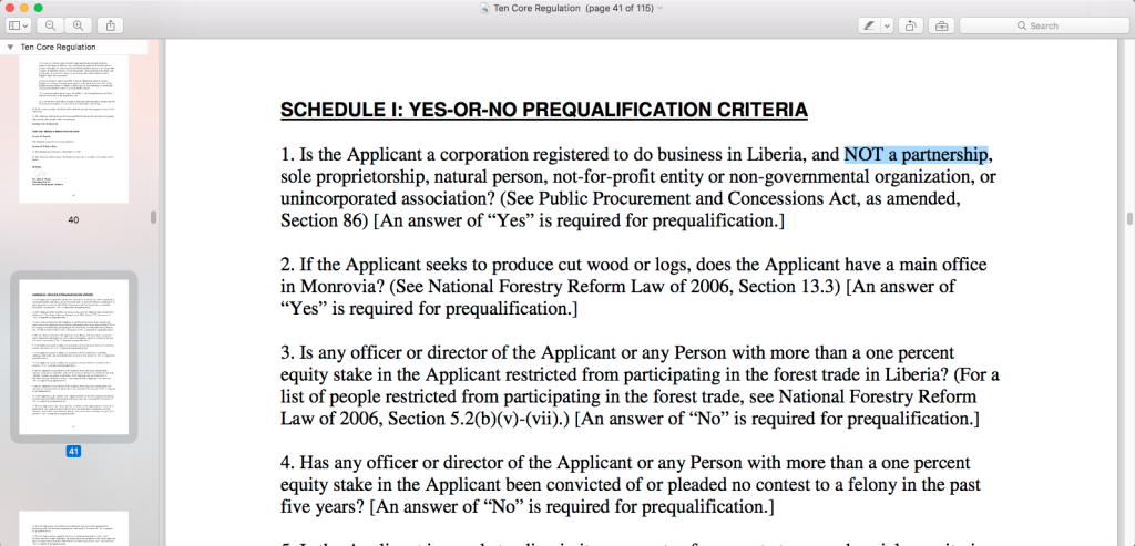 A screenshot of the relevant provision of the Regulation on Bidder Qualifications prohibits partnerships from conducting forestry activities in Liberia.