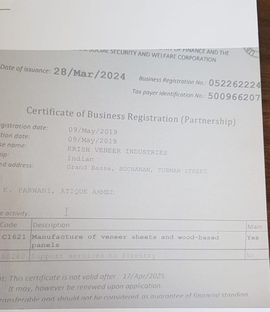 A screenshot of Krish Veneer Industries’ current business registration certificate, proving that the company is a partnership, not a corporation as it is required of forestry businesses.