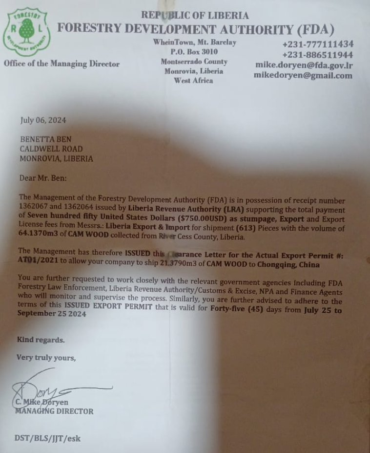 MONROVIA – The DayLight has obtained forged documents used by an unscrupulous father-daughter duo to smuggle timber out of Liberia. The newspaper also found evidence that the duo solicits money from other individuals.