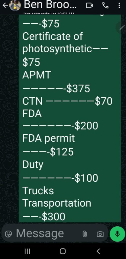 Other evidence suggests that not only Mr. Wesseh supports his daughter but also sells forged documents to other people. In a  WhatsApp message to a prospective customer, Mr. Wesseh shared a list of prices for several documents, including US$200 for an export permit and US$75 for a phytosanitary certificate. In all, Wesseh charged 2,370 to smuggle a 40-foot container.