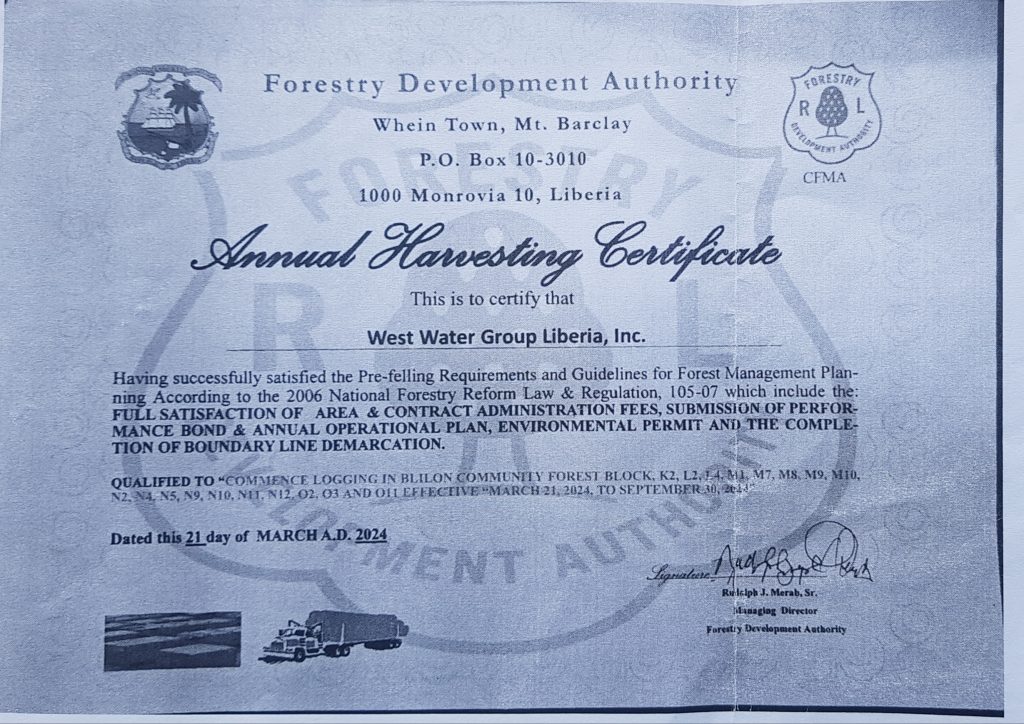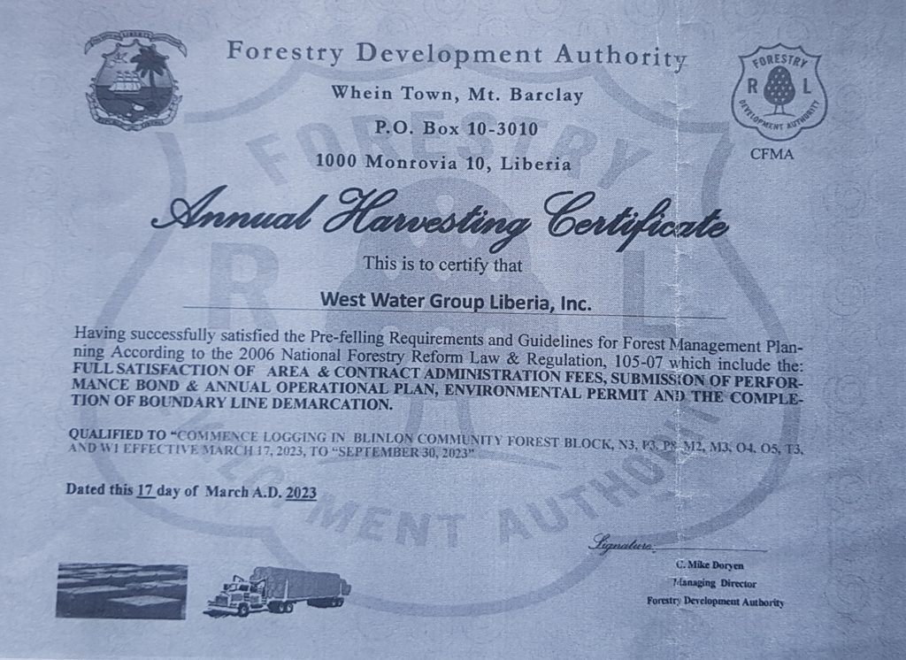 But that was not all the evidence The DayLight gathered. The investigation found that West Water did not have a harvesting certificate when the felling took place. The one Merab shared with The DayLight was not signed by then Managing Director Mike Doryen or a deputy.