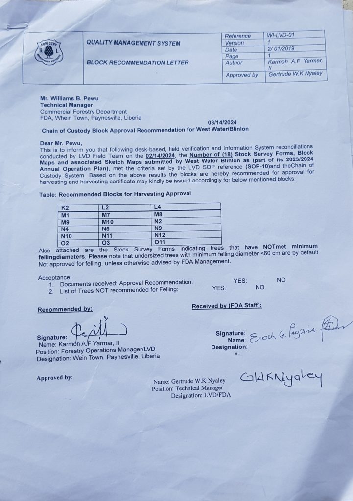 One document is dated 2019 and 2024, listing Nyaley as head of LVD. Nyaley was the technical manager of the community forestry department that year, appointed to LVD in 2022. And West Water did not have a contract in Grand Bassa or anywhere in 2019, at least not a direct one.