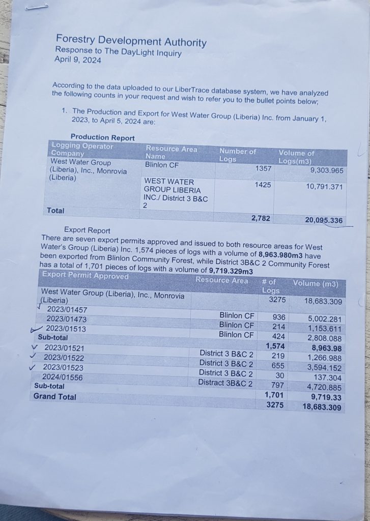 GAYEPUEWHOE TOWN, Grand Bassa County – Last month, a DayLight investigation uncovered the Forestry Development Authority (FDA) approved the export of 797 logs (4,702.679 cubic meters) valued at an estimated US$1 million for a company.