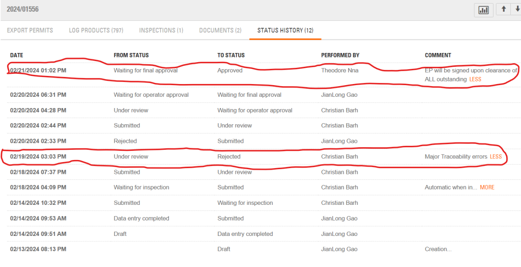 A screenshot of LiberTrace’s history of the 797 logs shows the FDA some of the trees were still standing when West Water requested to export them. It took the FDA’s legality verification department less than 48 hours to approve the request after rejecting it over “major traceability errors.”