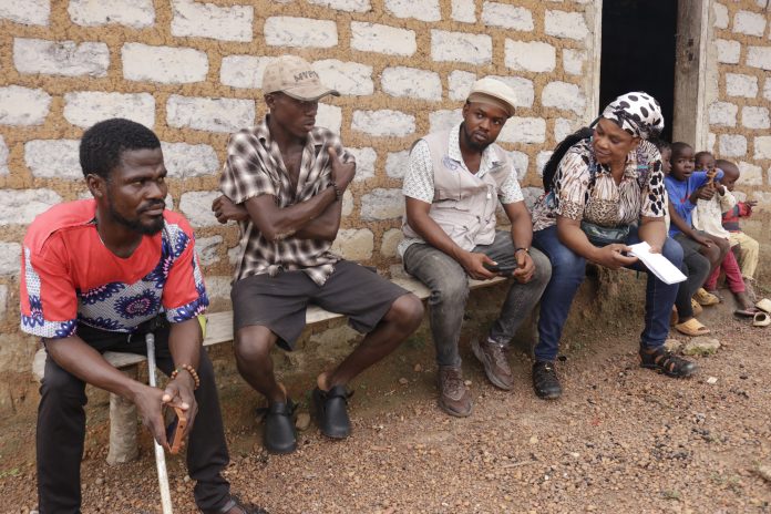 Top: A townsman speaks with the Land Authority and Parley Liberia fieldworker in Gbarmue, a town in the Jorpolu Clan, Jorquelleh District in Bong County. The DayLight/Varney Kamara